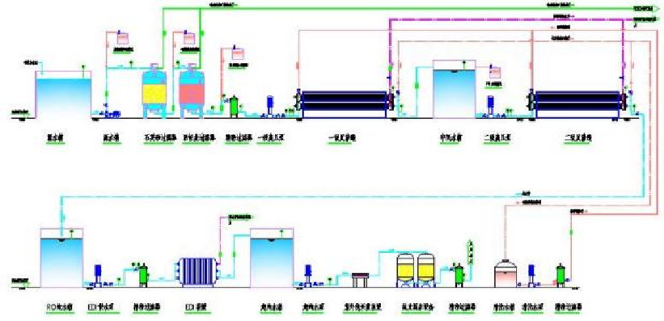 本項(xiàng)目合同總價(jià)105萬元,超純水系統(tǒng)的處理工藝流程分為:多介質(zhì)過濾器、活性炭過濾器系統(tǒng)、二級(jí)反滲透系統(tǒng)、EDI系統(tǒng)、SMB系統(tǒng)五部分。反滲透前的預(yù)處理部分選用多介質(zhì)+活性炭,以去除原水中的懸浮物、膠體、有機(jī)物、濁度等及調(diào)節(jié)水溫。反滲透系統(tǒng)作為本系統(tǒng)的主要除鹽設(shè)備。反滲透系統(tǒng)采用優(yōu)良膜元件,同時(shí)配備流量計(jì)、電阻率儀、電導(dǎo)率表等檢測儀表。