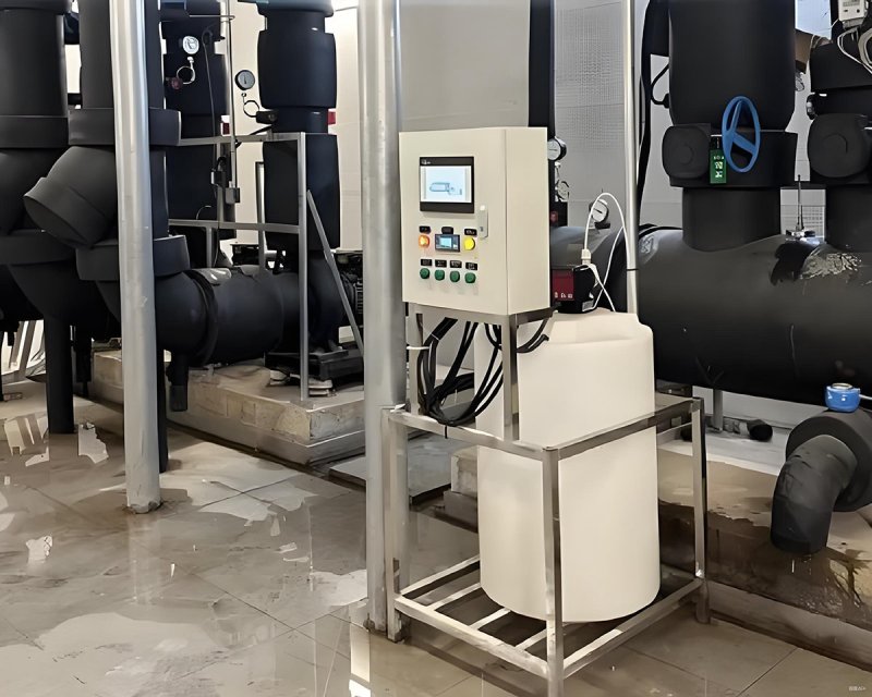 循環(huán)冷卻水處理的目的就在于消除或減少結(jié)垢、腐蝕和生物粘泥等危害,使系統(tǒng)可靠地運(yùn)行。循環(huán)水中能產(chǎn)生的鹽垢有許多種,如碳酸鈣、硫酸鈣、碳酸鎂、氫氧化錳、硅酸鈣等,其中以碳酸鈣垢較為常見,危害較大。自動(dòng)加藥裝置可以控制冷卻水的運(yùn)行濃縮倍數(shù),代替人工根據(jù)水質(zhì)變化自動(dòng)加藥達(dá)到緩蝕阻垢和殺菌滅藻效果,從而提高冷卻水系統(tǒng)的工作效益。