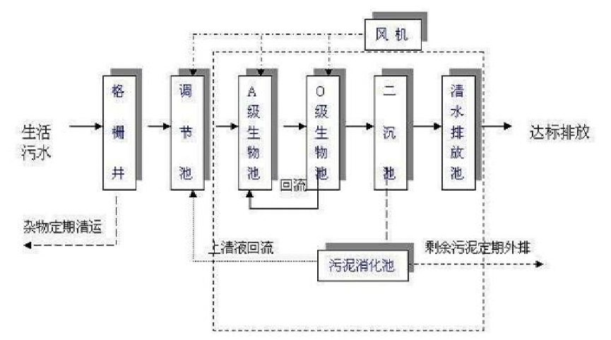 系列污水處理設(shè)備去除有機(jī)污染物及氨氮主要依賴于設(shè)備中的AO生物處理工藝。其中工作原理是在A級,由于污水有機(jī)物濃度很高,微生物處于缺氧狀態(tài),此時微生物為兼性微生物,所以A級池不僅具有一定的有機(jī)物去除功能,減輕后續(xù)好氧池的有機(jī)負(fù)荷,有機(jī)物濃度降低,但仍有一定量的有機(jī)物及較高NH3-N存在。為了使有機(jī)物得到進(jìn)一步氧化分解,同時在碳化作用下硝化作用能順利進(jìn)行,在O級設(shè)置有機(jī)負(fù)荷較低的好氧生物接觸氧化池。在O級池中主要存在好氧微生物及自氧型細(xì)菌(硝化菌)。其中好氧微生物將有機(jī)物分解成CO2和H2O;自養(yǎng)型細(xì)菌(硝化菌)利用有機(jī)物分解產(chǎn)生的無機(jī)碳或空氣中的CO2作為營養(yǎng)源,將污水中的NH3-N轉(zhuǎn)化成NO-2-N、NO-3-N,O級池的出水部分回流到A級池,為A級池提供電子接受體,通過反硝化作用消除氮污染。